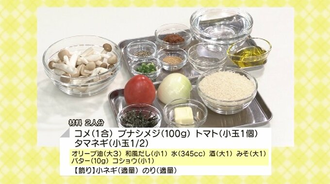 米(1合)/ブナシメジ(100g)/トマト(小玉1個)/タマネギ(小玉1/2)/オリーブ油(大3)/和風だし(小1)/水(345cc)/酒(大1)/みそ(大1)/バター(10g)/コショウ(小1)【飾り】小ネギ(適量)/のり(適量)