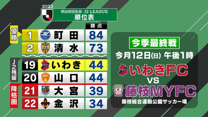自力での残留とはならなかったものの、降格圏21位の大宮アルディージャも敗れたため、いわきのJ2残留が決まりました。いわきFCは、12日に今季最終戦、アウェイの藤枝戦に臨みます。