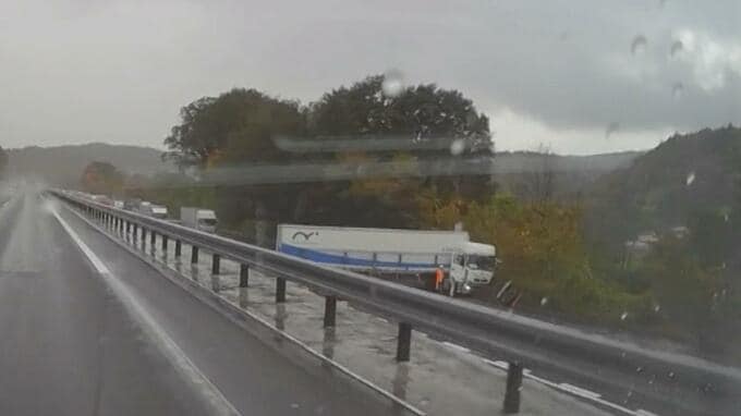 急ブレーキなどが原因で、トレーラーがくの字に曲がったような形になるいわゆる「ジャックナイフ現象」の可能性があり、警察が詳しい事故の原因を調べています。当時路面は濡れていたということです。