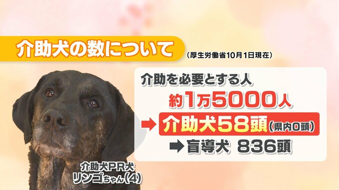 いま、全国には手足が不自由で介助を必要とする人がおよそ1万5000人いると言われていますが、厚生労働省によりますと、正式に認定された介助犬は全国でわずか58頭しかいません。目が不自由な人を補助する盲導犬は、全国で836頭いるのに比べると数が全く違います。福島県内には1頭もいないそうです。