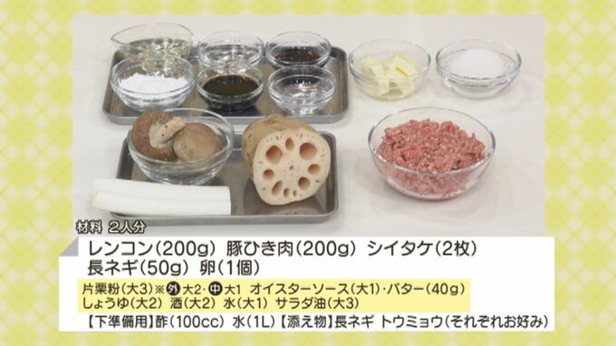 レンコン(200g)/豚ひき肉(200g)/シイタケ(2枚)/長ネギ(50g)/卵(1個)/片栗粉(大3)/オイスターソース(大1)/バター(40g)/しょうゆ(大2)/酒(大2)/水(大1)/サラダ油(大3)