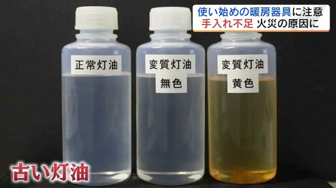 また、古く、変色した灯油は異常燃焼の原因に…。消防では、去年購入した灯油は使わずに、業者などに適切に処分してもらうよう呼びかけています。