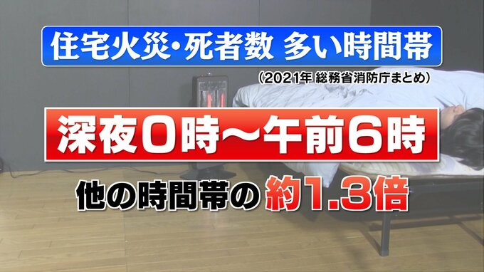 総務省消防庁のまとめによりますと、住宅火災の死者数が最も多いのは深夜0時から朝の6時にかけての時間で、他の時間帯と比べるとおよそ1.3倍の多さとなっています。