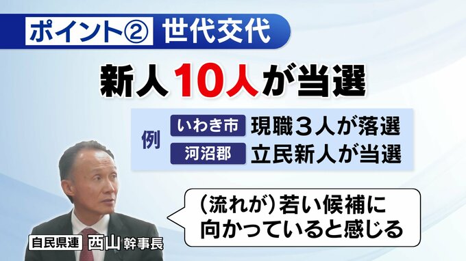 いわき市では、9期務めたベテラン議員を含めた3人が落選したほか、河沼郡では、立民の新人が自民の現職との一騎打ちを制して、当選しています。現職の多い自民党県連の西山幹事長も「(選挙の流れが)新人に向かっている」とコメントしています。