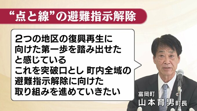 富岡町の山本町長は「2つの地区の復興再生に向けた第一歩を踏み出せたと感じている。これを突破口とし、町内全域の避難指示解除に向けた取り組みを進めていきたい」としています。