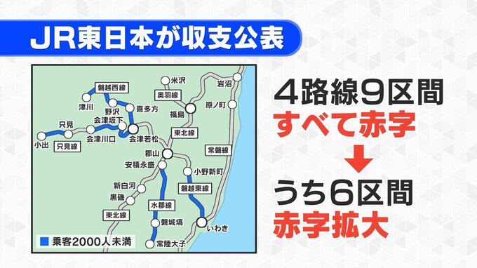 JR東日本が公表したのは、1日あたりの利用者が2000人未満の路線の経営状況です。このうち福島県内では、只見線、磐越西線、磐越東線、水郡線の4路線、9区間がすべて赤字で、6つの区間では、赤字が拡大しています。