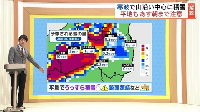 では、スーパーコンピューターで予想される雪の量を見ていきましょう。予想すると、このようになっていまして、会津の山沿いを中心にまとまった雪、10センチぐらい降るというところがありますが、中通りの平地では1センチに満たないような雪の量となっています。