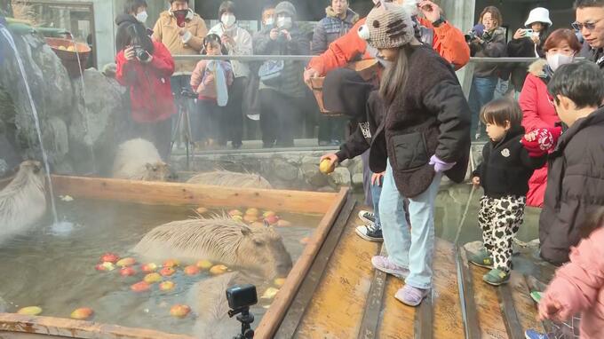 いい風呂の日の26日、栃木県の那須どうぶつ王国では、カピバラの好物のリンゴ100個を露天風呂に浮かべるイベントを開きました。医者いらずの健康フルーツとも言われるリンゴには、カピバラも訪れた人も「冬を健康に乗り切ってほしい」という願いが込められています。寒さが苦手なカピバラは、温かいお風呂と好物のリンゴで幸せいっぱいの様子でした。