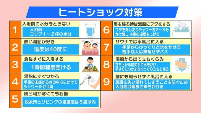 早坂教授に、それぞれの改善方法を教えてもらいました。例えば、(1)の「入浴前に水分はとらない」は、「入浴前にコップ1~2杯の水分をとる」。(5)の「風呂場が寒くても我慢」は、「脱衣所とリビングの温度差は5℃以内にする」。(6)の「湯を張る時は湯船にフタをする」は、「フタを外したりシャワーを2~3分かけ流したりして浴室の温度を上げる」などの対策が必要だということです。