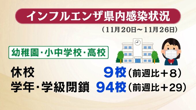 県内では26日までの1週間で、幼稚園や小・中学校、高校で9校が臨時休校。94校が学年や学級閉鎖となっていて、前の週と比べ、37校増えています。子どもたちの間で感染が広がり、さらにそれが家庭内に持ち込まれるというケースも相次いでいます。