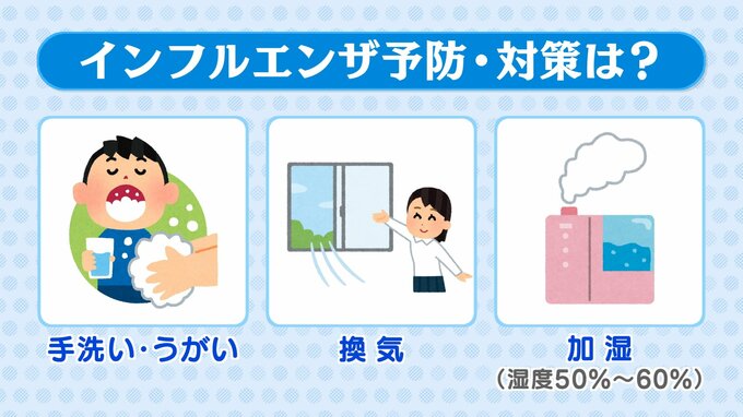 インフルエンザの予防に「乾燥」は大敵です。加湿器などを使って、部屋の湿度は50%~60%に保ちましょう。
