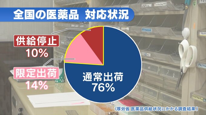 厚生労働省が今年10月に調査したデータでは、医薬品全体の4分の1が「限定出荷」や「供給停止」となっていて、このうち「供給停止」は10%を占めています。