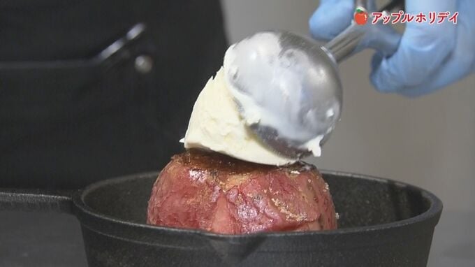 リンゴは真っ赤で酸味が強めな紅玉を使用。オーブンで焼いたリンゴの中にはラムレーズンとクッキー生地が詰められており、上にシナモンと砂糖を振りかけバーナーであぶりブリュレ状に。そしてその上にバニラアイスをのせて、キャラメルシロップをかければ出来上がり!