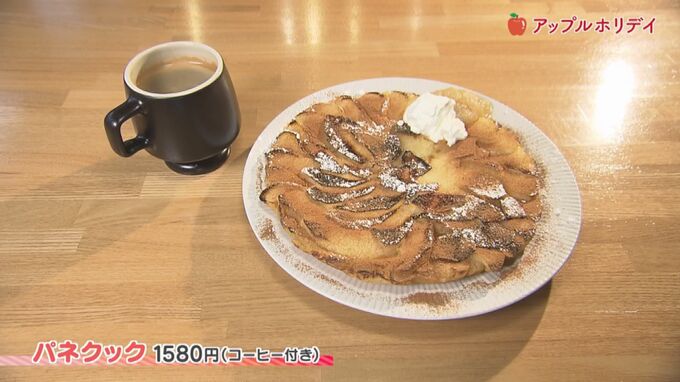 築50年の古民家を改装して出来た、飯坂温泉街にある「cafe HIRANAGA(カフェ ヒラナガ)」。こちらで提供しているリンゴスイーツはりんごの「パネクック」(1580円・コーヒー付き)です。