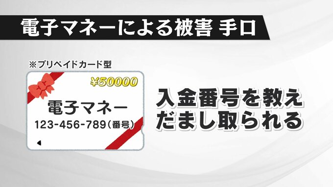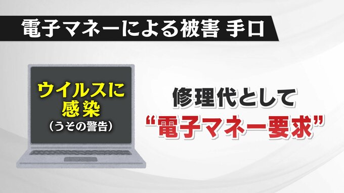 県警本部によりますと、電子マネー被害は、1回あたりに要求される金額が5万円ほどと、ほかの詐欺と比べても少額であるため、被害者は「このくらいの金額で修理できるのであれば支払える」という心理が働くといいます。