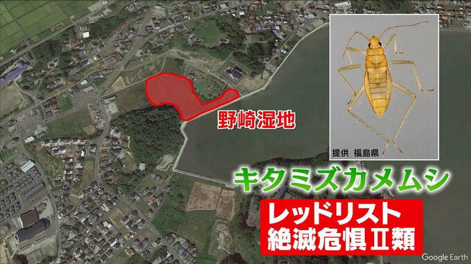 今回問題の舞台になっている野崎湿地は、広さはおよそ2ヘクタール、陸上競技場のトラックの内側ほどの面積です。県の調べでは、水生昆虫のキタミズカメムシなど、県内で絶滅が危惧される動植物が確認されています。