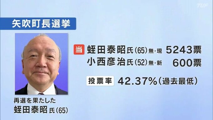 矢吹町長選挙 現職・蛭田氏が再選 新人を大差で破る 福島 2023年12月25日(月) 12:25 国内 任期満了に伴う福島県矢吹町長選挙は、24日に投開票が行われ、現職の蛭田泰昭さんが新人を破り、当選しました。矢吹町長選挙は、現職の蛭田泰昭さんが5243票を獲得し、新人に4000票以上の大差をつけて2回目の当選…