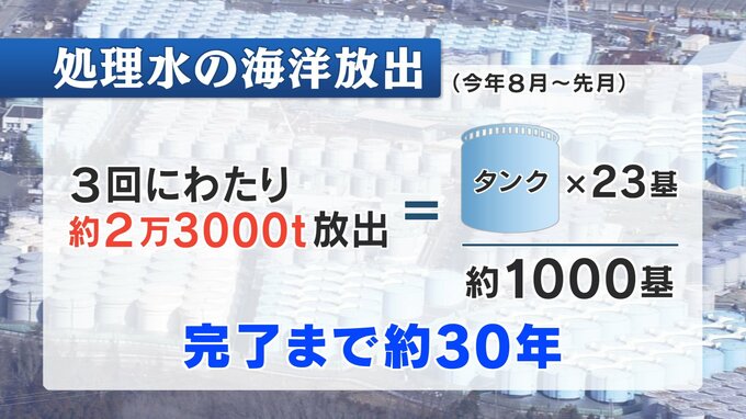 福島第一原発では、今年8月から11月まで、3回にわたって処理水が海に放出されました。その量は、合わせて2万3000トンあまりです。構内のおよそ1000基あるタンクの23基分に相当しますが、処理水は、日々増え続けているので放出が終わるまで30年程度かかるとされています。