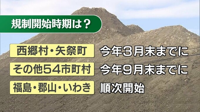 開始時期は、西郷村と矢祭町にはすでに規制すべき盛り土があることから、今年3月末までに適用するとしていて、その他の54市町村は9月末までに、福島市など中核市についても、順次規制を適用します。