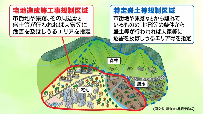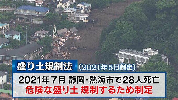 今回適用されるのが、「盛リ土規制法」という法律は、2021年7月、静岡県熱海市で28人が亡くなった土砂崩れなどを受けて、危険な盛り土を規制するために制定されたものです。