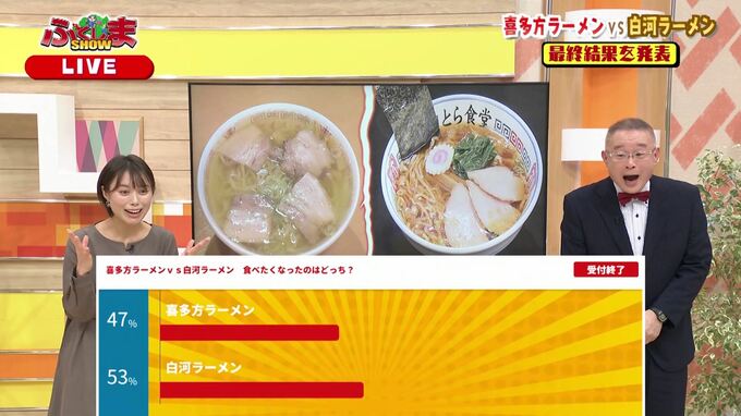 今回の放送ではの僅差で「白河ラーメン」の勝利となりました。