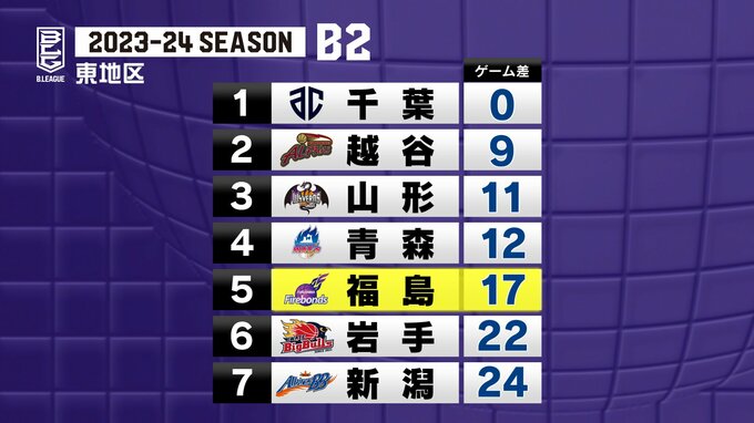 ボンズが所属するB2東地区の順位表です。首位の千葉との差は大きく開いていますが、プレーオフ圏内はまだまだ狙える位置につけています。後半戦の巻き返しに期待です。