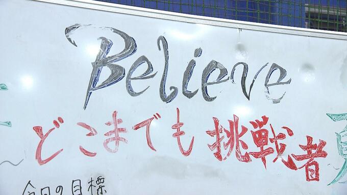 室内練習場のホワイトボードに記された「ビリーブ」の文字。去年夏の県大会決勝前に佐々木監督が口にした「信じる」という言葉を、新チームを立ち上げる際にスローガンに掲げました。