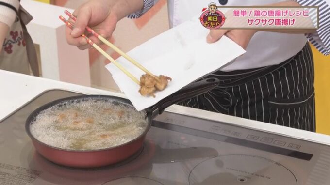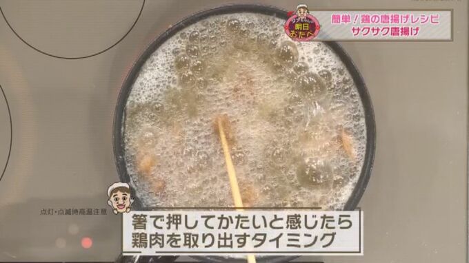 7.から揚げを箸で持ち上げたときに、手にジンジンと振動がきたら火が通っているサインなので(約4分)油から取り出し完成!