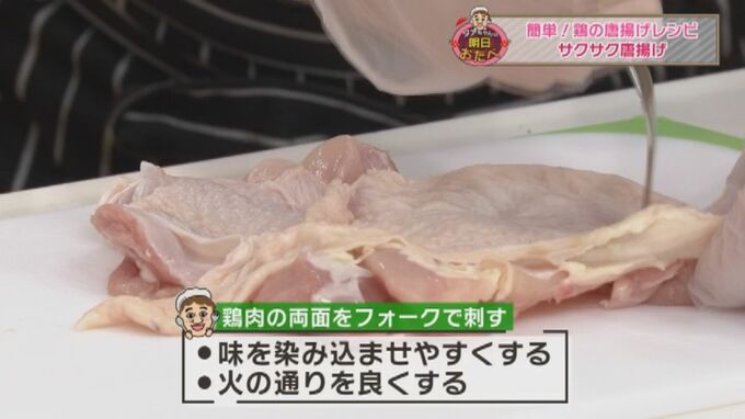 2.サクサクから揚げ同様、鶏肉の両面にフォークで刺し穴をあけ、食べやすい大きさに切る。さらにニンニクをみじん切りにする。
