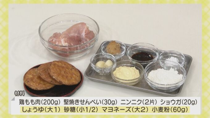 鶏もも肉(200g)/堅焼きせんべい(30g)/ニンニク(2片)/ショウガ(20g)/しょうゆ(大1)/砂糖(小1/2)/マヨネーズ(大2)/小麦粉(60g)