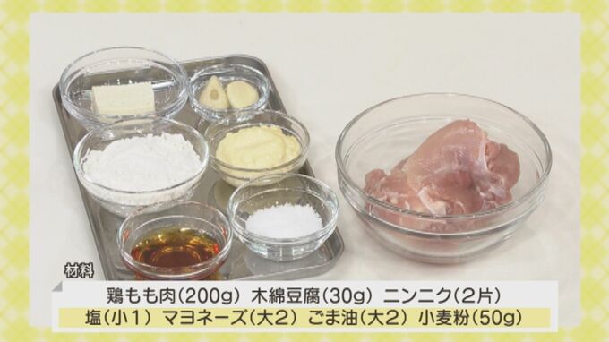 鶏もも肉(200g)/木綿豆腐(30g)/ニンニク(2片)/塩(小1)/マヨネーズ(大2)/ごま油(大2)/小麦粉(50g)