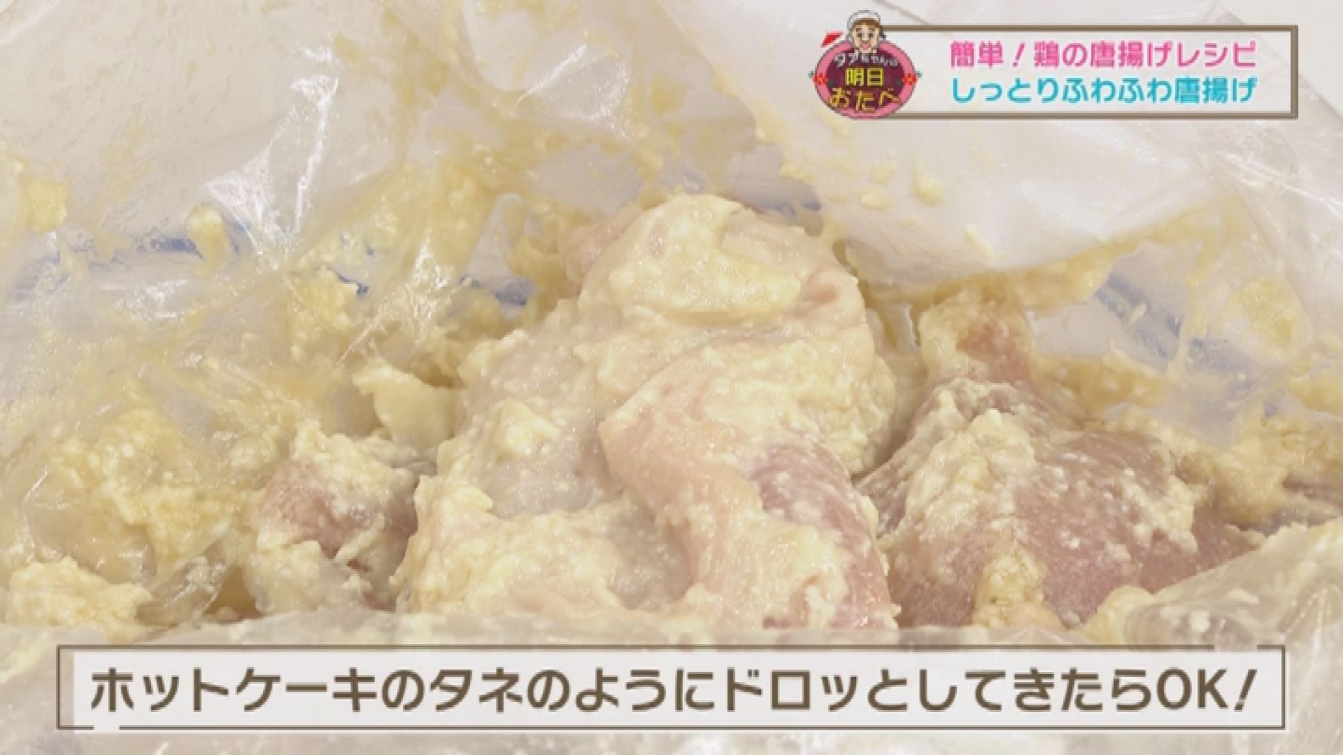 下味をつけた肉に、さらにマヨネーズ(大2)を加えてもみ込む。マヨネーズで鶏肉をコーティングすることで、肉がパサパサ・カチカチになるのを防ぎ、臭みも消すことが出来る。