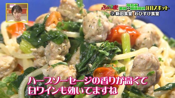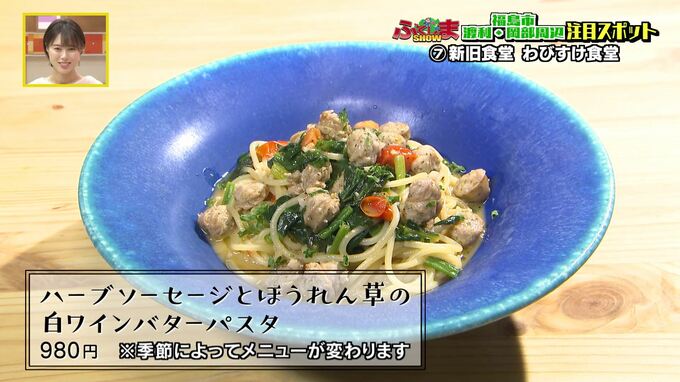 ---玲奈アナウンサー「ん~おいしい!ハーブソーセージの香りが高くて白ワインも効いてますね。食堂なのにカフェみたいなメニューですよ!」