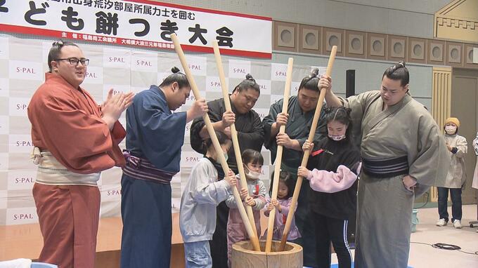 3日、福島市で子どもたちと一緒に餅をついていたのは、若元春ら大波3兄弟をはじめとした、荒汐部屋の福島市出身力士たち。市内から小学生など150人が集まり、会場にはヨイショという元気なかけ声が響きました。