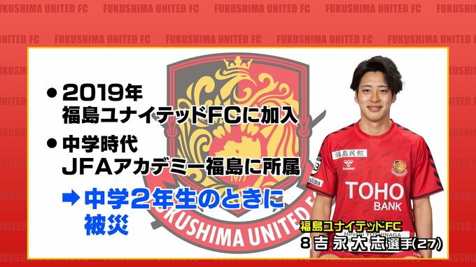 そして今回卒業生のこの選手に話を聞きました。福島ユナイテッドFCの吉永大志選手です。吉永選手は中学時代JFAアカデミー福島に所属していて、中学2年生の時に被災し、その後は静岡で活動していました。