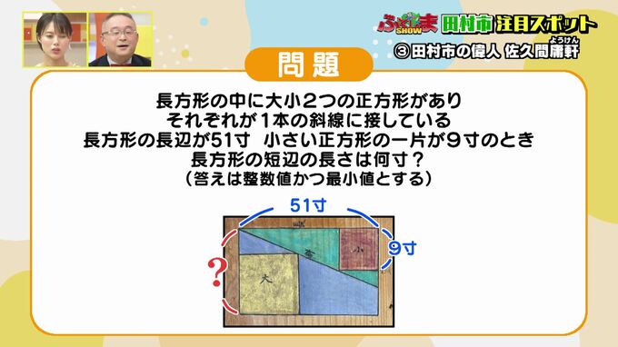その問題は、長方形の長辺と、その中にある小さい正方形の一辺の長さから、長方形の短辺の長さを求めるというもの。現代の数学だと中学生が解ける問題だそうです(答えは最後にあります)。