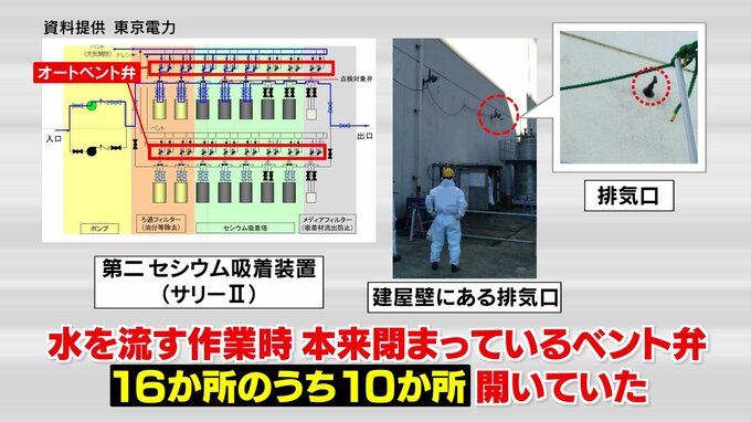 東京電力によりますと、この水を流す作業の時に手動で閉じなければならない「弁」16か所のうち、10か所が開いたままでした。これが水が漏れた直接の原因で、なぜこの弁が開いていたのか、作業員から聞き取りを行うなどして調べることにしています。