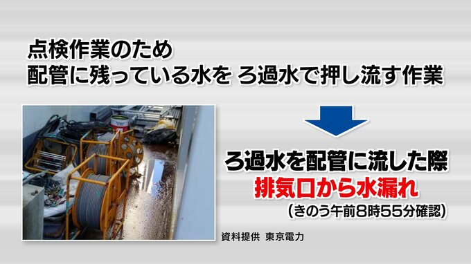 この装置では7日、通常の運転を止め、点検を行うために、配管に残っている水をろ過した水で押し流す作業が行われていました。その「ろ過水」を流したところ、排気口から汚染水を含む水がおよそ40分間漏れた可能性があるということです。