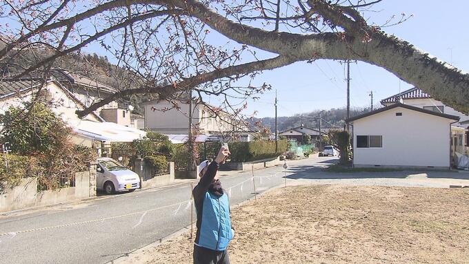 水津邦治アナウンサー「去年水害で根元が水に浸かったサクラ、春のような陽気に誘われて開花しました」