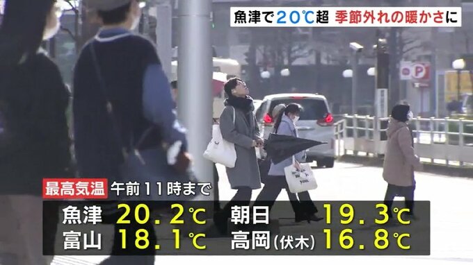 午前11時までに魚津で20.2℃富山では18.1℃を観測し、4月中旬から下旬並みの暖かさとなっています。