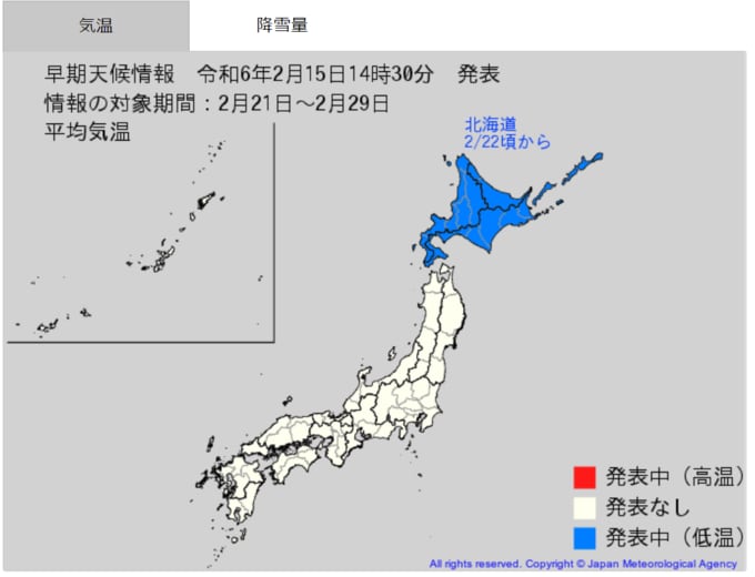 気象庁は、15日、関東と北陸地方で「春一番」が吹いたと発表しました。北陸では去年の2月28日に比べて13日早く、関東では14日早い発表です。また、東京では21℃を超えるなど、各地でまさに春の陽気となっています。一方、北海道については「低温に関する早期天候情報」が発表され、22日ごろからこの時期としては10年に1度の「かなりの低温」となる見込みです。