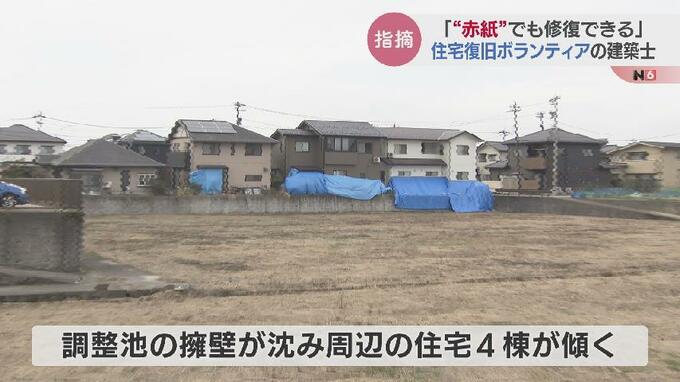 この家の裏にある調整池の擁壁が地震で沈んだことで、周辺の住宅4棟が傾きました。県による応急危険度判定で立ち入りが「危険」とされたことを示す赤い紙が張られていますが―。