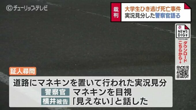 これによりますと事故と同じ時間帯に道路にマネキンを置いて行われた実況見分で、警察官がマネキンを目視できたにもかかわらず、横井被告は「見えない」と話したといいます。