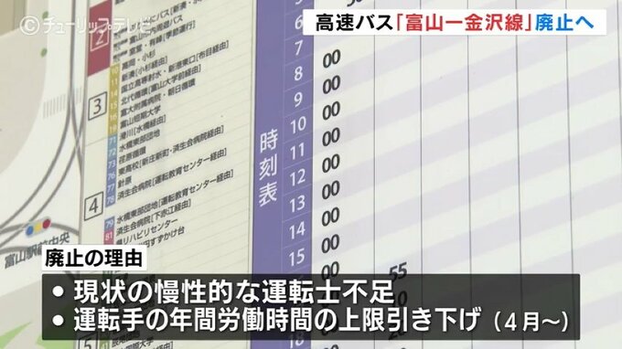廃止の理由について、富山地方鉄道は、現状の慢性的な運転士不足に加え、4月以降運転手の年間労働時間の上限が引き下げられることなどからバスの運転士不足に拍車がかかることをあげています。