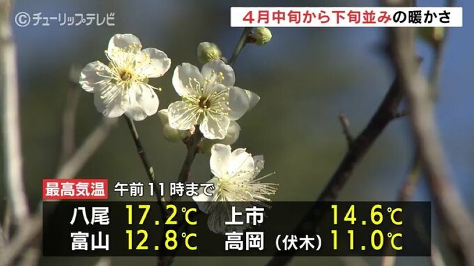 高気圧に覆われた県内には、暖かい南風が入り込み、朝から気温がぐんぐん上がっています。午前11時までに、八尾で17.2℃、富山では12.8℃を観測し、4月中旬から下旬並みの暖かさとなっています。