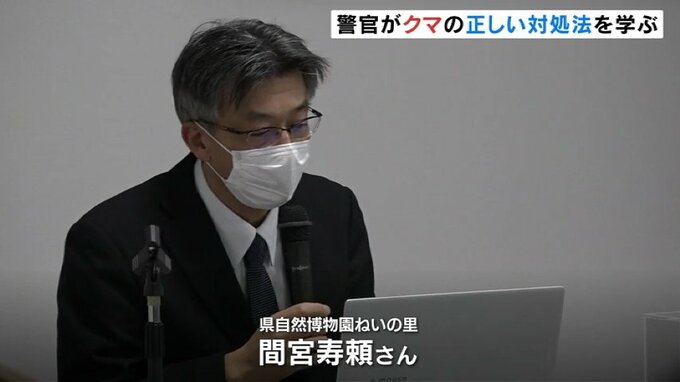 研修ではクマの生態に詳しい富山県自然博物園ねいの里の間宮寿頼さんが、クマは逃走する対象を追いかけ鋭いツメで顔面や頭部をひっかくケースが最も多いと説明。
