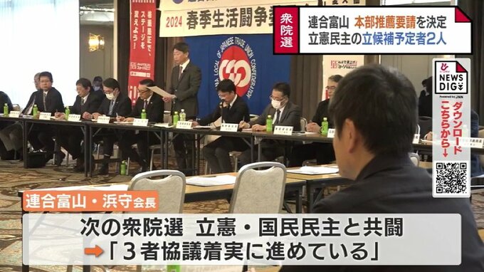 連合富山の浜守会長は次の衆院選では立憲民主党と国民民主党が選挙区ごとに候補者をすみ分けて共闘するよう、3者協議を着実に進めているとしています。