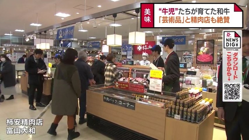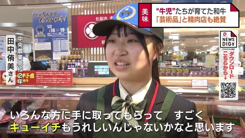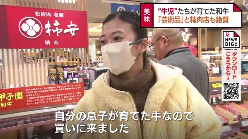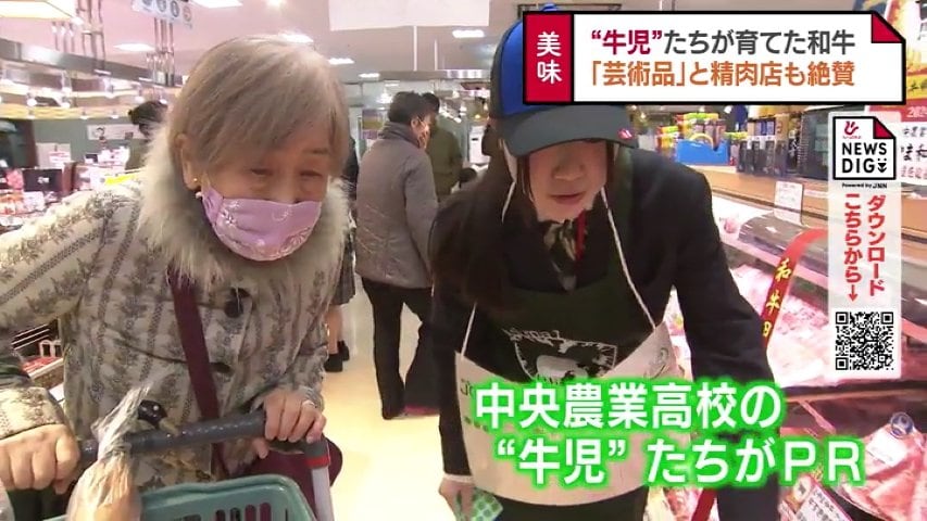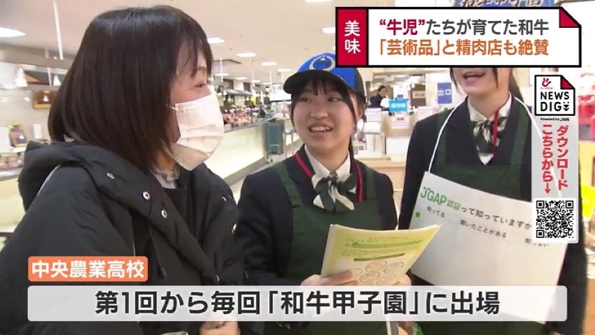 松坂肉の老舗「柿安精肉店」で25日まで販売されているこの牛肉は、全国の農業高校生たちが和牛の肉質を競う「和牛甲子園」に出品されたもので、23日は、この牛を飼育した富山県立中央農業高校の「高校牛児」たちが自ら店頭で美味しさをPRしました。