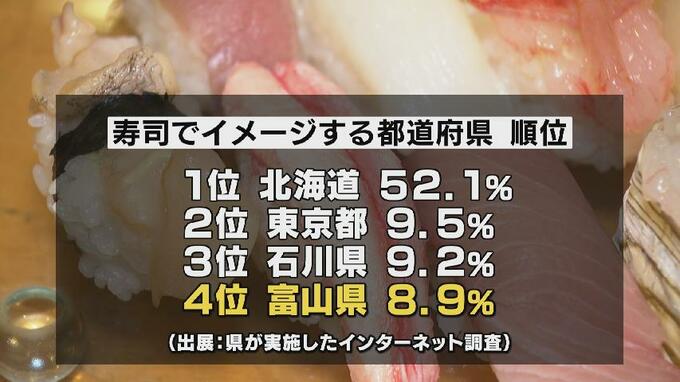 2023年に県が3大都市圏を対象に独自で行った調査ではすしと聞いてイメージする都道府県の順位は北海道、東京、石川に続いて富山は4位で全体の8.9パーセントにとどまりました。