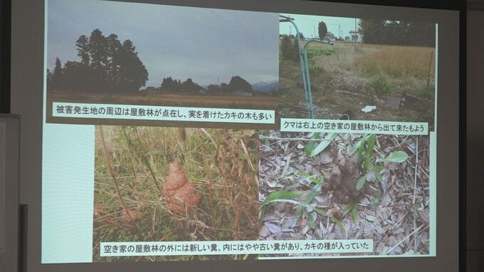 赤座さんは「実をつけたまま放置されたカキの木はクマの『えさ場』で、生い茂った屋敷林は『隠れ場所』。ドングリ類の不作で空腹状態のクマをひきつけて、長時間滞在させる結果になった」としています。
